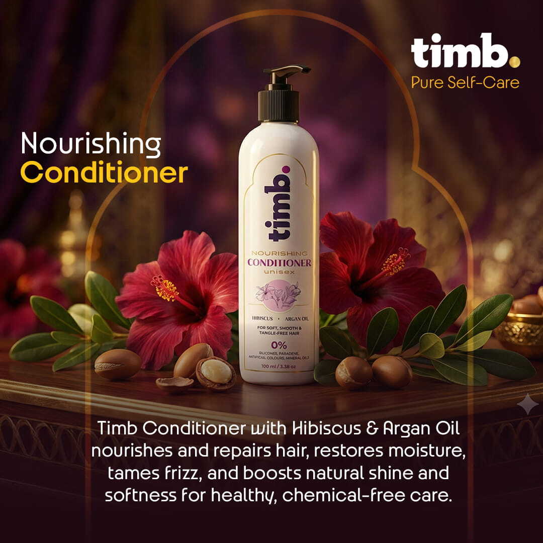 Argan Oil and Hibiscus-infused Timb Conditioner is a nourishing formula for hair. It continuously repairs damage, locks in moisture for long-lasting hydration, controls frizz for smooth manageability, and enhances hair with ultra shine and softness, giving your hair the care it deserves without silicones, parabens, artificial colors, or mineral oils.