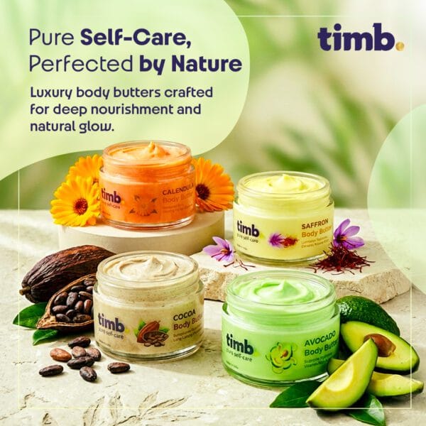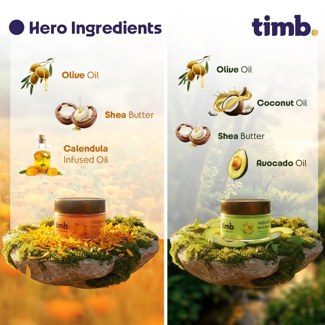 Timb Avocado Body Butter highlight its exclusive blend of natural, plant-derived oils and butters including avocado oil, shea butter, coconut oil, olive oil, almond oil, beeswax, and vitamin E, combined with a mild natural fragrance. This formulation is designed to provide deep moisturizing care while supporting skin barrier health and elasticity without harsh chemicals, making it ideal for sensitive and dry skin.