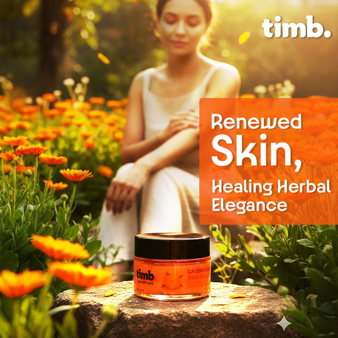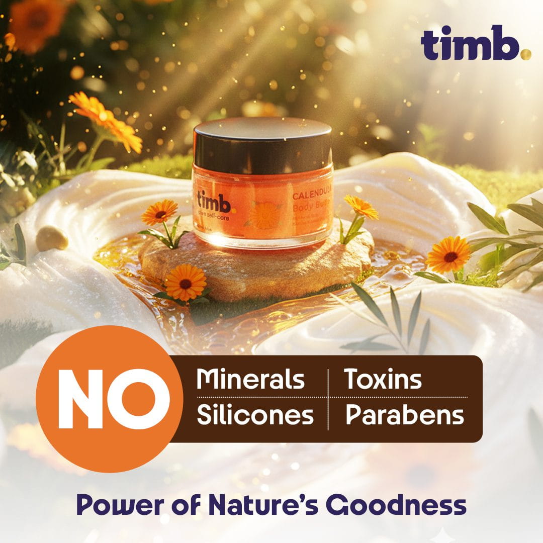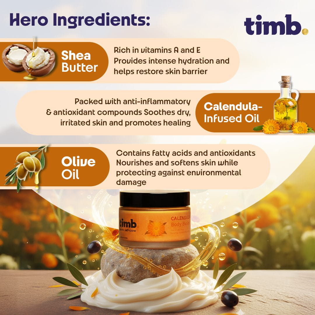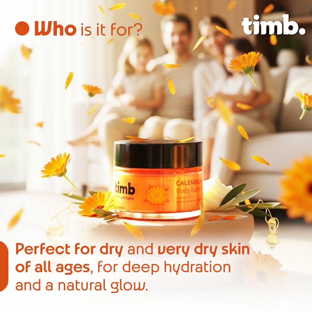 The smooth, creamy consistency absorbs without greasiness, instantly reviving dull, tight, or flaky areas and transforming them into beautifully hydrated, glowing skin. With every use, Timb Calendula Body Butter delivers a touch of botanical luxury — replenishing your skin’s moisture balance and protecting it from everyday stressors like pollution, dryness, and harsh climates.