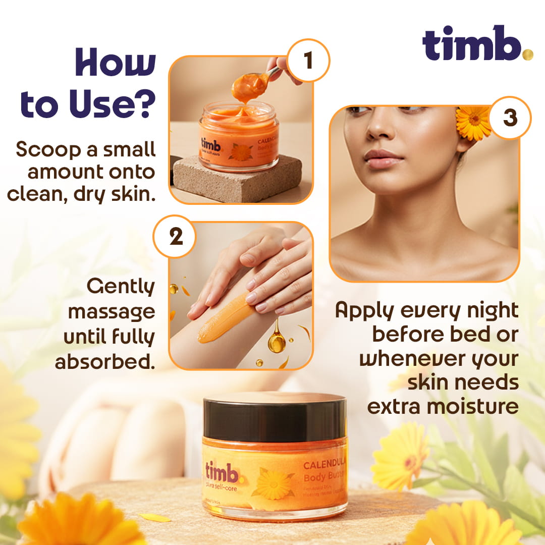 Apply a small amount of Timb Calendula Body Butter onto clean, dry skin and massage gently until fully absorbed. For best results, use daily before bedtime or whenever your skin needs extra moisture and protection. It is ideal for sensitive skin and perfect for regular hydration to keep skin feeling supple and nourished.