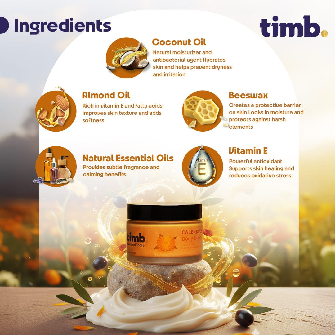 Timb Calendula Body Butter is handmade using carefully selected natural ingredients like shea butter, calendula-infused oil, olive oil, and vitamin E. It is free from synthetic fragrances, parabens, and harsh chemicals, making it perfect for sensitive and delicate skin types. This body butter not only moisturizes deeply but also supports skin healing with the calming benefits of calendula, making it an ideal choice for everyday self-care.