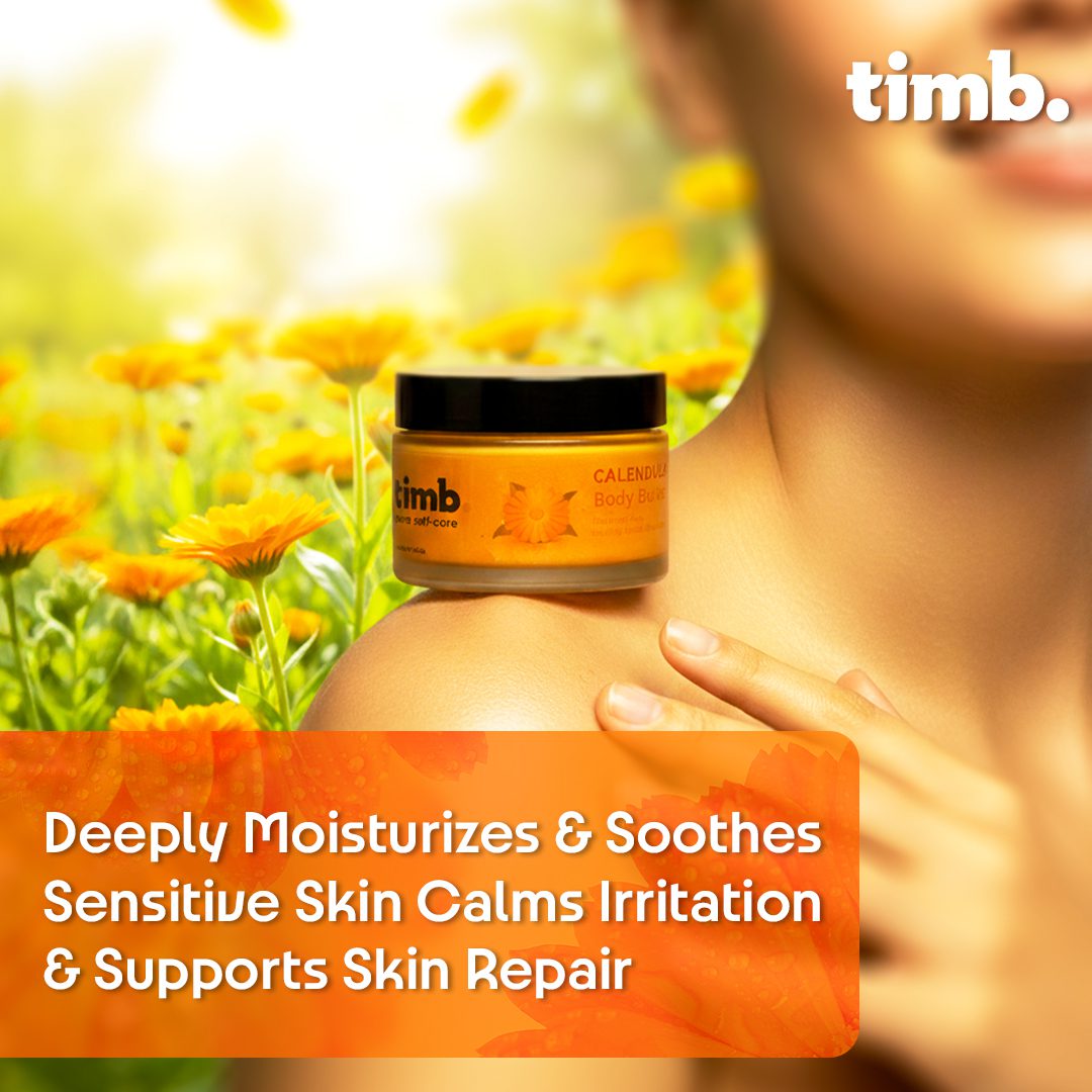 Gentle enough for all skin types yet powerful enough to repair deeply, it’s a daily treat your skin will crave. Experience the calming and healing touch of calendula with the wholesome richness of shea and coconut — a perfect blend that captures the essence of natural skincare. Reveal your skin’s softest, smoothest, and healthiest texture — naturally, with Timb.